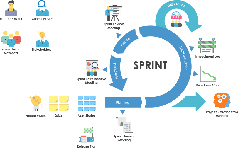 Sono le molte somiglianze tra i valori del metodo agile project management e i processi di scrum che ci conducono a questa associazione. Gli sprint aiutano i team a seguire il principio base dell’agile project management: “consegnare frequentemente software funzionante“, così come a vivere attraverso il valore base dell’agile management: “rispondere al cambiamento piuttosto che seguire un piano“. I valori scrum sono trasparenza, ispezione e adattamento, complementari alla gestione progetti agile e centrali nel concetto di sprint.